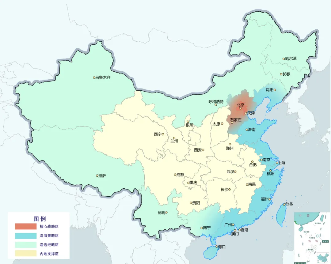 核心戰(zhàn)略區(qū):北京、天津、河北(雄安);沿海策略區(qū):遼寧、山東、江蘇、上海、浙江、福建、廣東、廣西、海南、香港、澳門、臺灣;沿邊經略區(qū):廣西、云南、西藏、新疆、內蒙古、黑龍江、吉林、遼寧;內地支撐區(qū):貴州、重慶、四川、青海、甘肅、寧夏、陜西、山西、河南、湖北、安徽、江西、湖南。