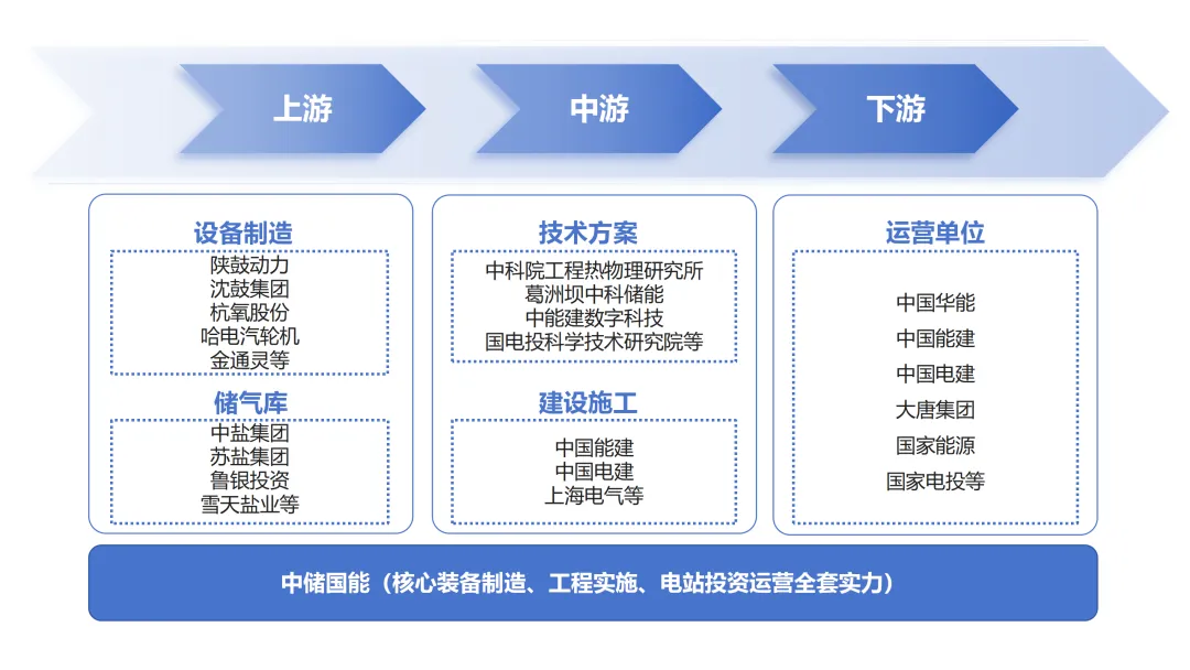 壓縮空氣儲能產(chǎn)業(yè)鏈長、覆蓋廣,上游產(chǎn)業(yè)為設(shè)備制造和儲氣庫,中游為技術(shù)提供及工程建設(shè)方,下游為投資運營商(業(yè)主單位),目前在研發(fā)和制造等核心環(huán)節(jié)無卡點,基本實現(xiàn)全環(huán)節(jié)國產(chǎn)化。