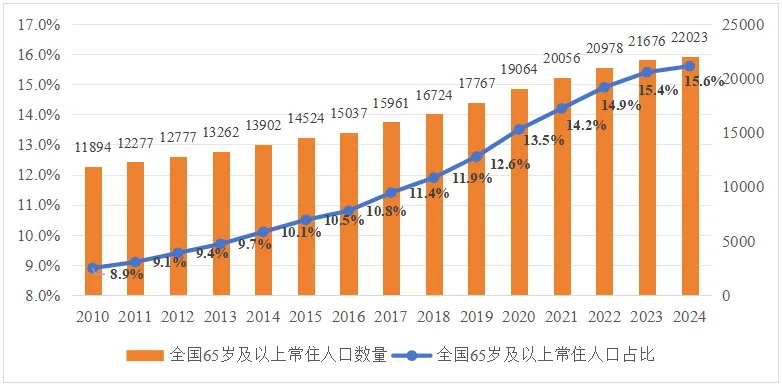 圖1 2010—2024年全國65歲及以上老年人口規(guī)模及占比情況統(tǒng)計
