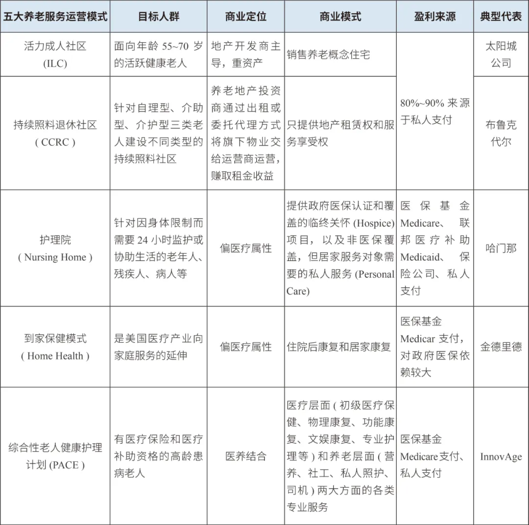 美國的養(yǎng)老服務(wù)模式中,機(jī)構(gòu)模式出現(xiàn)最早,商業(yè)化程度高,但后續(xù)出現(xiàn)的基于社保的社區(qū)和居家模式也日益受到青睞。機(jī)構(gòu)模式以獨(dú)立養(yǎng)老社區(qū)為主,商業(yè)化運(yùn)作,提供活力成人社區(qū)(ILC)、持續(xù)照料退休社區(qū)(CCRC)等多元化養(yǎng)老場景,滿足不同護(hù)理服務(wù)需求。養(yǎng)老社區(qū)通常由地產(chǎn)開發(fā)商、專業(yè)養(yǎng)老地產(chǎn)運(yùn)營商參與運(yùn)營,以成立投資信托基金的方式減輕總資產(chǎn)模式下前期資金投入以及后期運(yùn)營的壓力,已形成了完整的融資、建設(shè)、運(yùn)營專業(yè)體系。