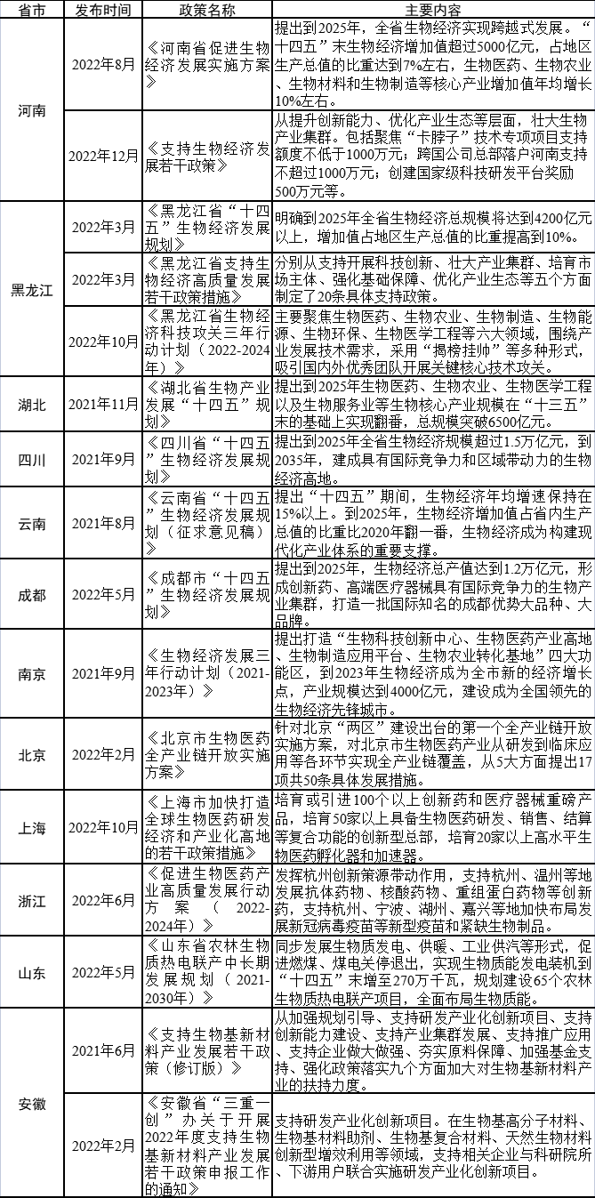 2021年3月,國家“十四五”規(guī)劃綱要在“構(gòu)筑產(chǎn)業(yè)體系新支柱”中提出“做大做強(qiáng)生物經(jīng)濟(jì)”;2022年5月,國家發(fā)改委正式對外發(fā)布了《“十四五”生物經(jīng)濟(jì)發(fā)展規(guī)劃》,明確到2025年,生物經(jīng)濟(jì)將成為我國推動高質(zhì)量發(fā)展的強(qiáng)勁動力。這是我國首部生物經(jīng)濟(jì)五年規(guī)劃,標(biāo)志著我國正式進(jìn)入生物經(jīng)濟(jì)新時代。當(dāng)下我國生物經(jīng)濟(jì)加速發(fā)展,進(jìn)入勃發(fā)上升期。國內(nèi)多省市相繼出臺多項支持政策,大力推進(jìn)生物經(jīng)濟(jì)發(fā)展,著力打造經(jīng)濟(jì)發(fā)展的新增長極。