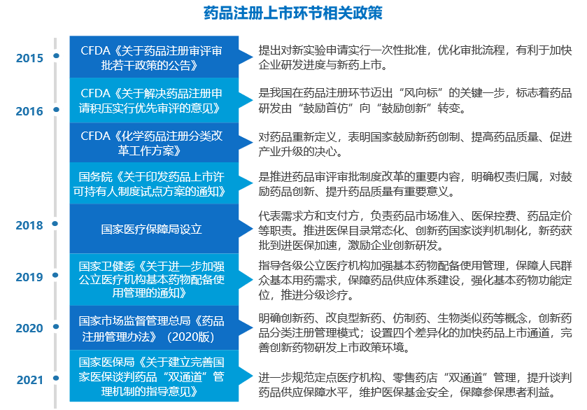20世紀期間我國醫藥工業以化學仿制藥物為主。2000年以后,隨著國外高價品牌藥進入中國市場,國內科研院所、實力企業開始加快新藥研發步伐,但大部分傳統藥企仍以生產仿制藥為主。自2008年起國家開始啟動“重大新藥創制”專項,劍指重大藥物自主創新推動我國醫藥行業轉型。2011年,浙江貝達藥業的肺癌靶向藥物埃克替尼國內獲批上市,打響國產創新藥第一槍,雖然該藥仍屬國外原研藥的“派生藥”,但其療效超過了國外“母藥”,大大振奮了我國醫藥行業創新的信心。2014年江蘇恒瑞醫藥研發的用于治療晚期胃癌的小分子藥物阿帕替尼全球首個獲批上市,這是我國自主研發出的第一個真正意義上的創新藥,標志著我國創新藥發展進入新階段。2015年以來,國家陸續出臺了一系列在藥品上市注冊、醫保采購與流通等環節強有力的鼓勵創新藥發展的政策,大大激發了藥企新藥研發的動力,創新藥臨床試驗申請(IND)和新藥注冊申請(NDA)數量迅速增長,創新藥市場占比逐漸加大。