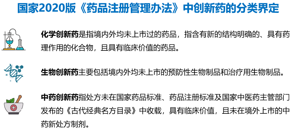 創新藥也稱原研藥,相對于仿制藥而言,是指從機理開始源頭研發,具有自主知識產權,具備完整充分的安全性有效性數據作為上市依據,首次獲準上市的藥物。國家2020版《藥品注冊管理辦法》對創新藥進行了分類界定。