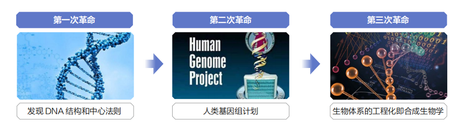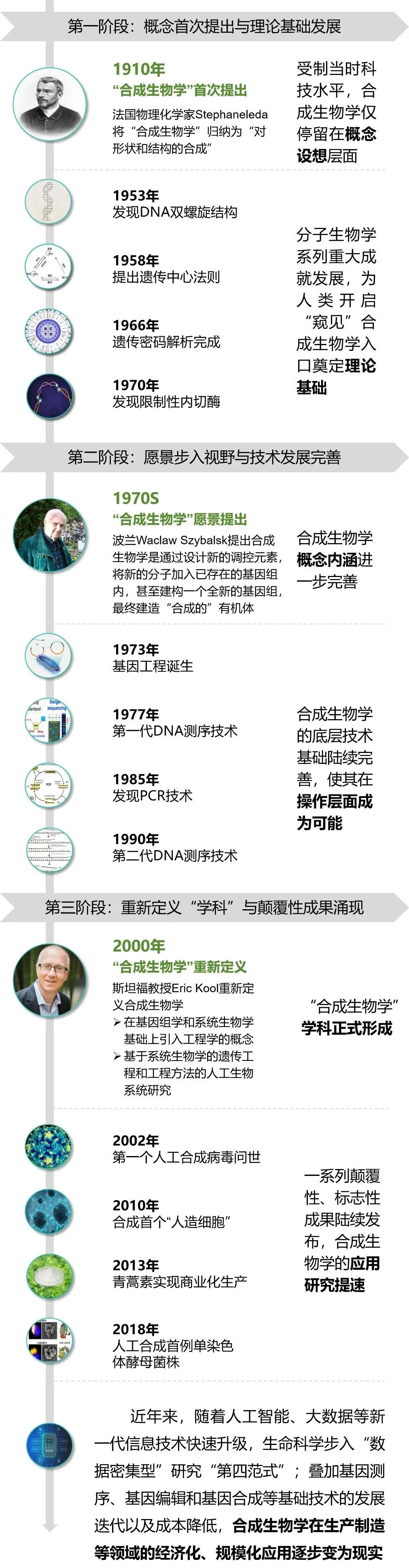合成生物學(xué)自概念提出到現(xiàn)在發(fā)展歷史已超百年。最早可溯源至19世紀(jì)中葉合成化學(xué)的出現(xiàn)打破無機(jī)物和有機(jī)物的界限,推翻“生命力論”,顛覆了人類對生命體(動物、植物、微生物等)的認(rèn)知。此后,“細(xì)胞學(xué)說”“生物化學(xué)”“遺傳學(xué)說”等相繼提出,人類從細(xì)胞層面、分子層面實(shí)現(xiàn)對生命體認(rèn)識的飛躍,合成生物學(xué)亦隨之演化。總體看,合成生物學(xué)發(fā)展歷程大致可分為三大階段: